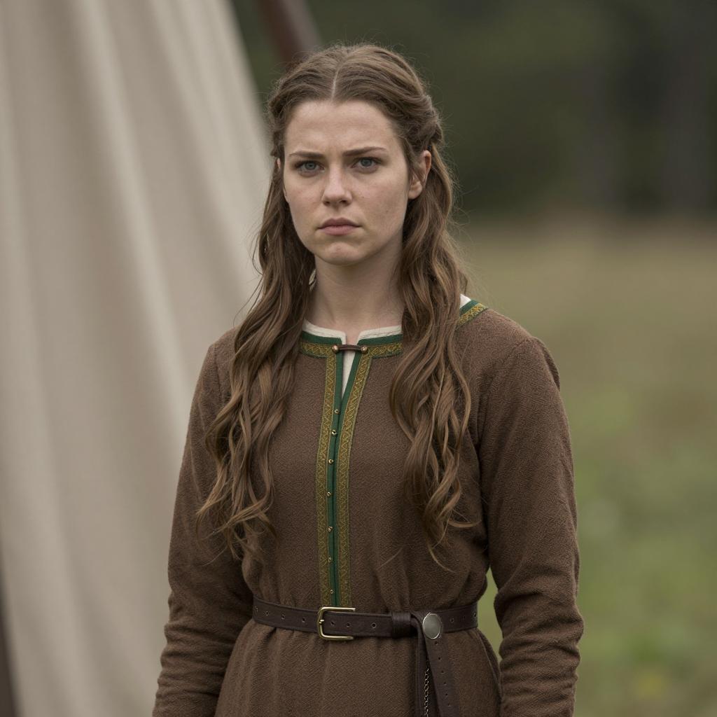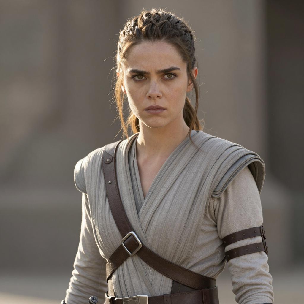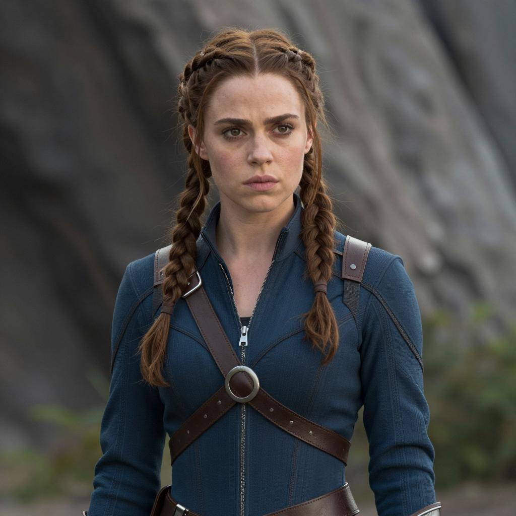 Close-up portrait of a woman with braided brown hair wearing a dark blue, form-fitting bodysuit with brown leather straps and belts. She stands in front of a large, blurred rocky background with some green foliage. The serious expression and detailed realistic lighting emphasize a fantasy and action-hero style mood.