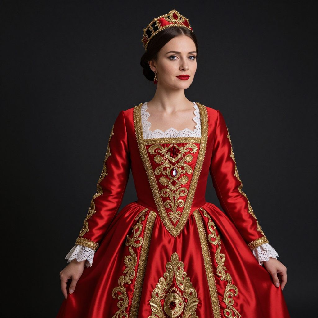 Elegant portrait featuring a woman adorned in a richly detailed Cracovian costume, characterized by a vibrant red satin gown with gold embellishments, a lace-trimmed neckline, and a matching headpiece, set against a dark background that accentuates her regal attire.