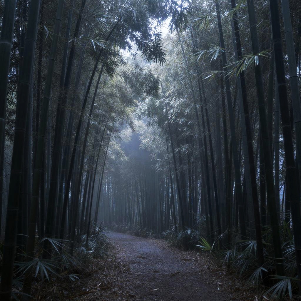 Moonlit bamboo forest with silvery light filtering through dense leaves, a narrow path winding between towering bamboo trees, ethereal mist hovering low, peaceful and enchanting scene