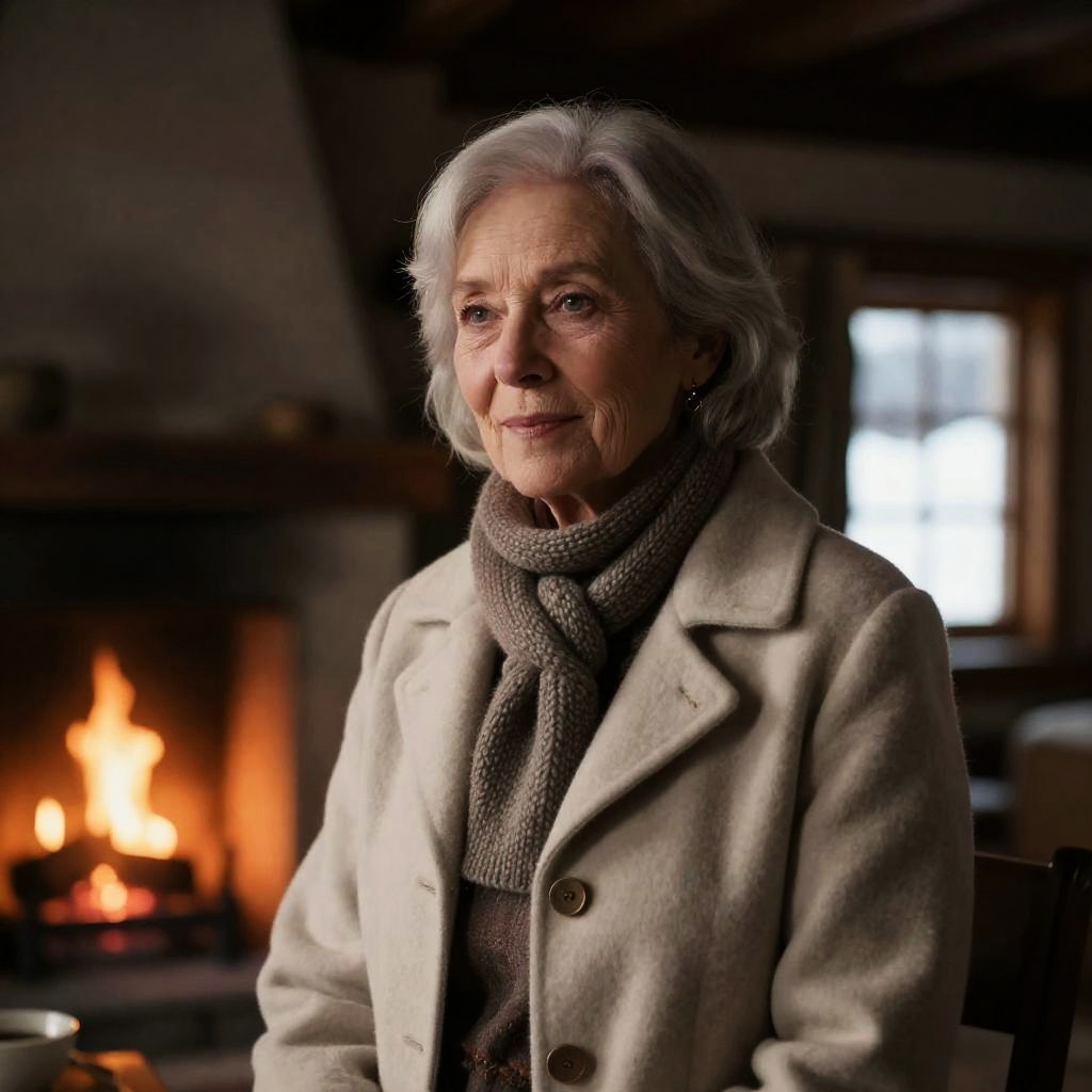 Portrait of a sophisticated middle-aged woman with silver hair wearing a floor-length satin evening gown seated at an elegant outdoor restaurant terrace. The scene is softly illuminated by numerous candles on tables, creating a warm, romantic atmosphere. The woman is accessorized with a delicate pearl necklace and matching earrings, surrounded by a cinematic, detailed background with fine ambient lighting and tasteful decor.