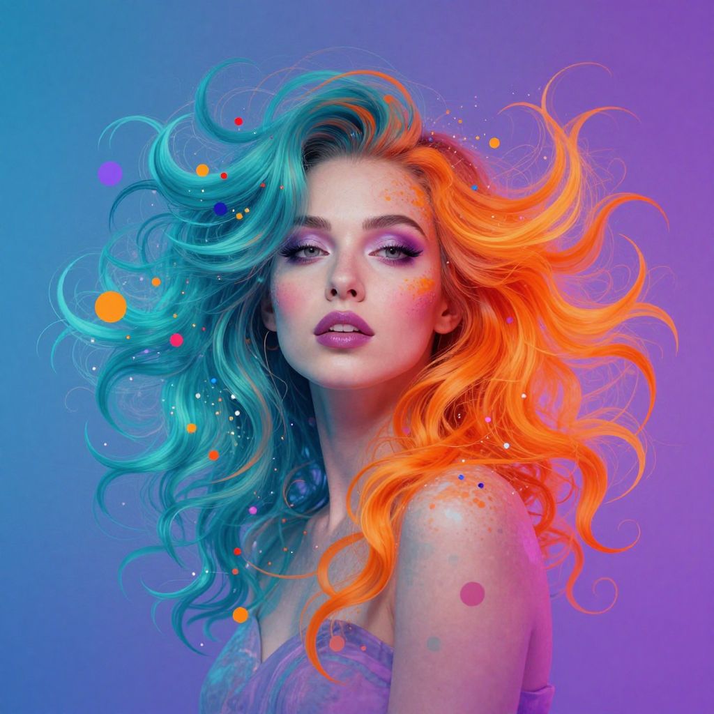 Vibrant abstract portrait featuring a woman with flowing hair transitioning from teal to fiery orange, adorned with colorful dots and swirls against a gradient background of blues and purples, evoking a dreamlike, psychedelic aesthetic.