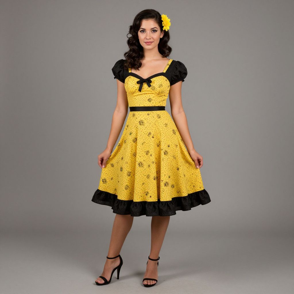 A photograph of a young woman standing against a plain gray background. She has dark brown, wavy hair adorned with a yellow flower on the right side. She's wearing a vintage-style yellow dress with black floral patterns, black puffed sleeves, and a black ruffled hem. She completes the look with black high-heeled sandals. Her confident stance and slight smile exude a retro charm.