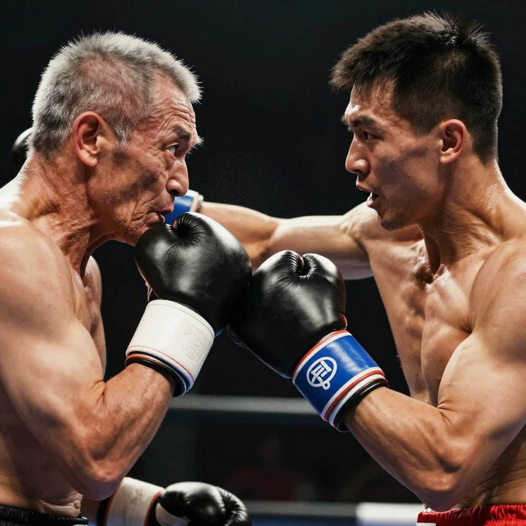 Two muscular shirtless Asian male boxers in the ring, one older with gray hair and the other younger, wearing black boxing gloves and red trunks. The younger boxer is delivering a punch to the older boxer, whose facial expression shows the impact. The scene captures the intensity and realism of a boxing match.