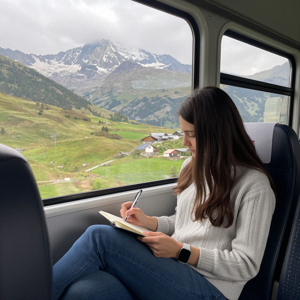 Woman traveling in the Gornergrat train, seated comfortably by a window, writing in a notebook while enjoying the scenic view of mountains and greenery outside.