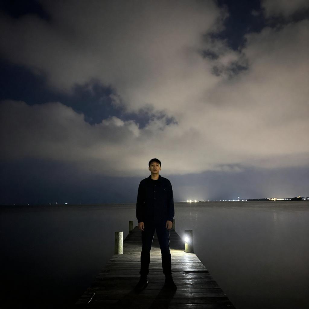 Nighttime outdoor scene featuring two people standing in a grassy field under a large, leafless tree. One person faces the camera, holding a glowing lantern that illuminates their face, while the other person bends over facing away. Clear, dark sky with scattered stars in the background.