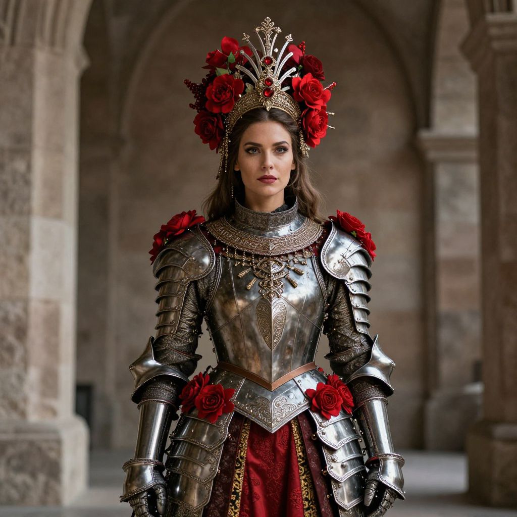 Photograph-style CGI of a woman in ornate, red-rose-adorned medieval armor with a crown, standing in a stone archway.