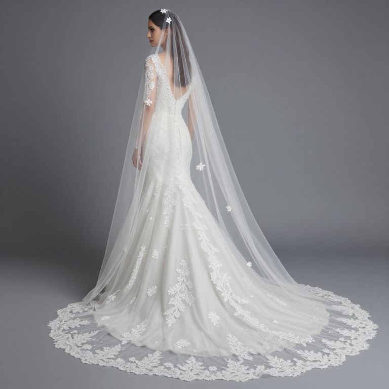 \"Bel Aire Bridal Veils V7445C - 108\"\" Inches - cut edge cathedral veil with lace and scattered appliqués\