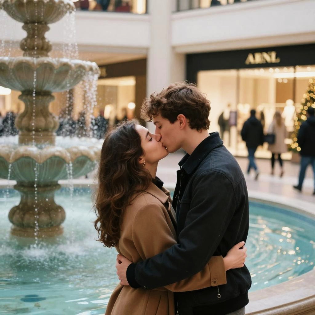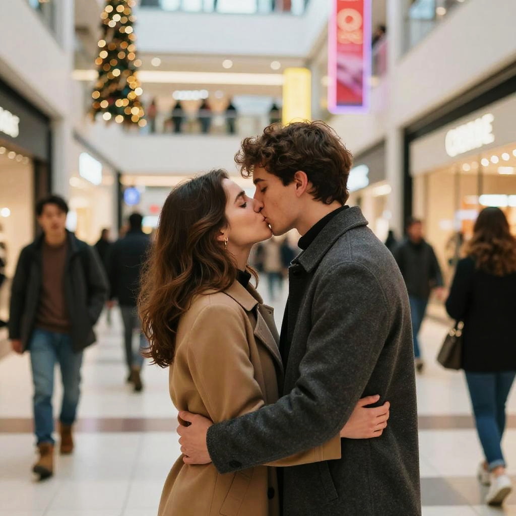 Kissing at the mall, passionate kiss between a couple near a toy store with vibrant window displays, lively crowd blurred in the background, rich textures and soft natural lighting, emotional scene