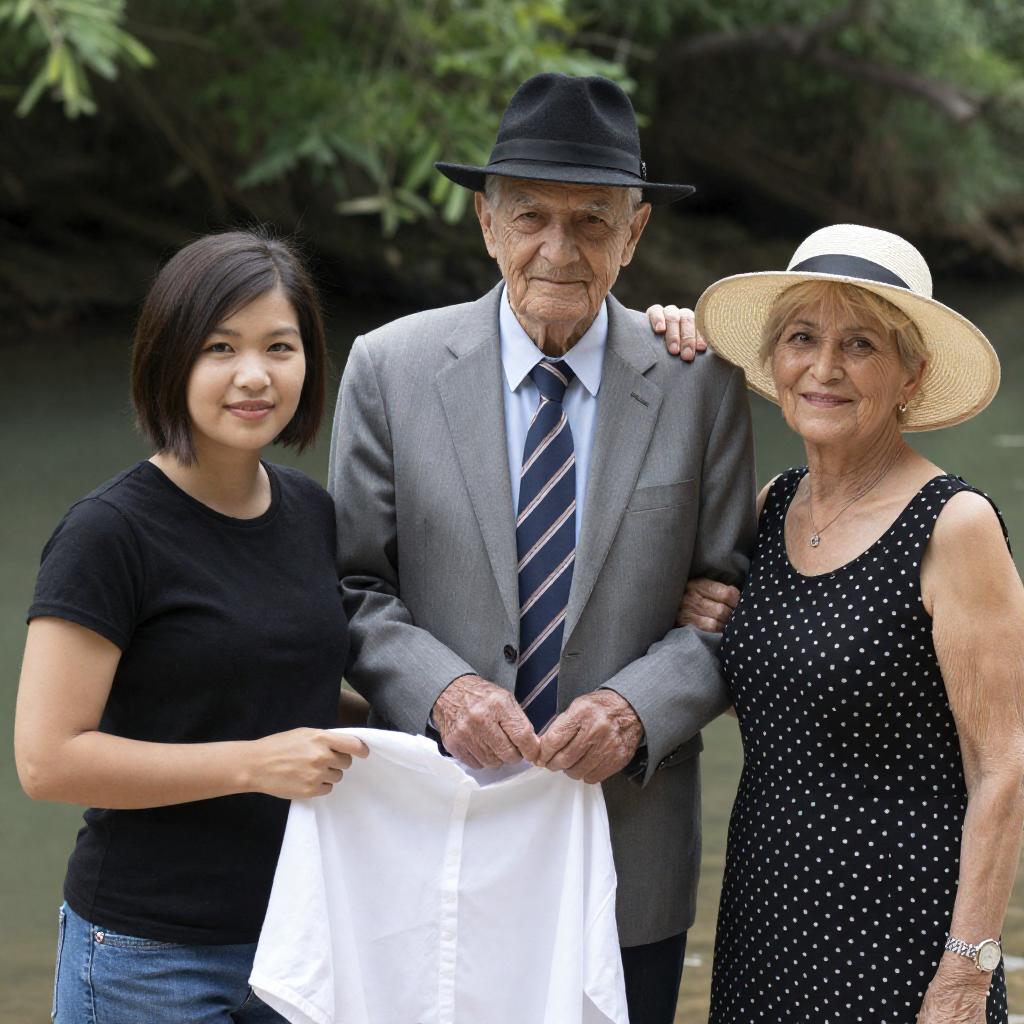 Photograph of three people by a river. Elder man in gray suit, striped tie, black hat, center. Young woman with short dark hair, black shirt, left, holding white cloth. Older woman with blonde hair, wide-brimmed hat, black polka dot dress, right, smiling. Green foliage in background. Elder man's hands on young woman's cloth, older woman's arm around his shoulder. Casual outdoor setting.