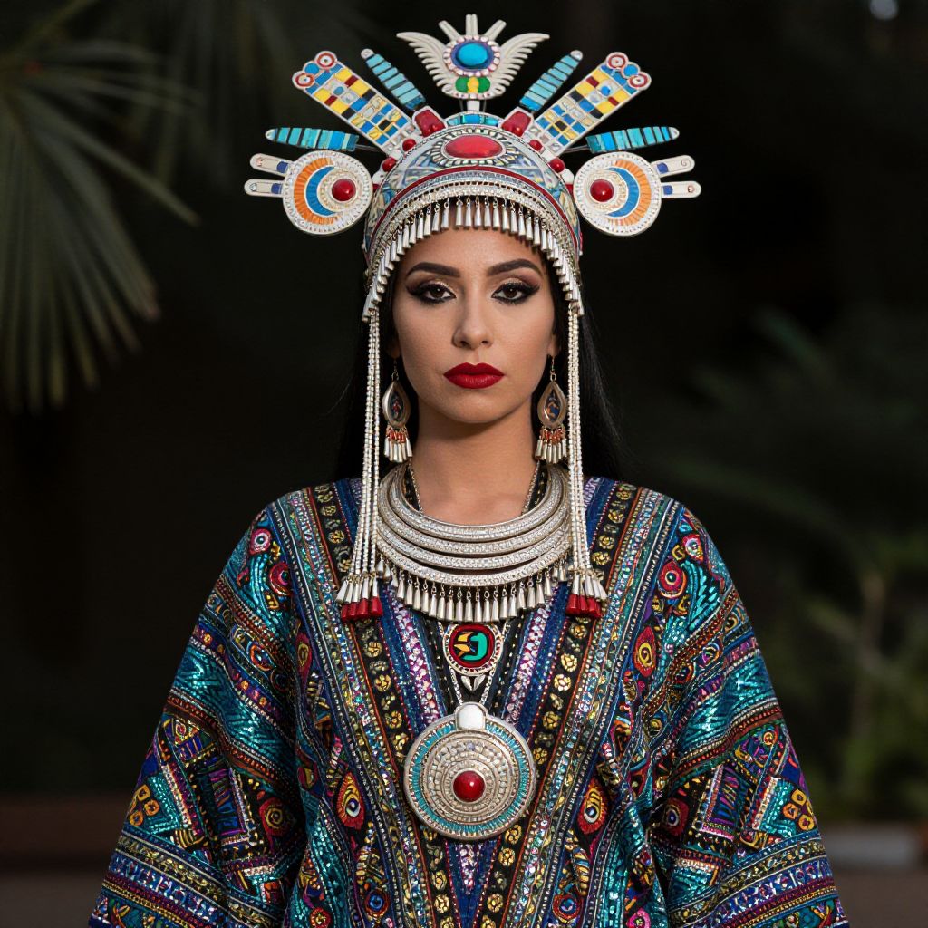 A woman adorned in intricate, psychedelic Aztec-inspired attire with iridescent patterns and a detailed headdress.