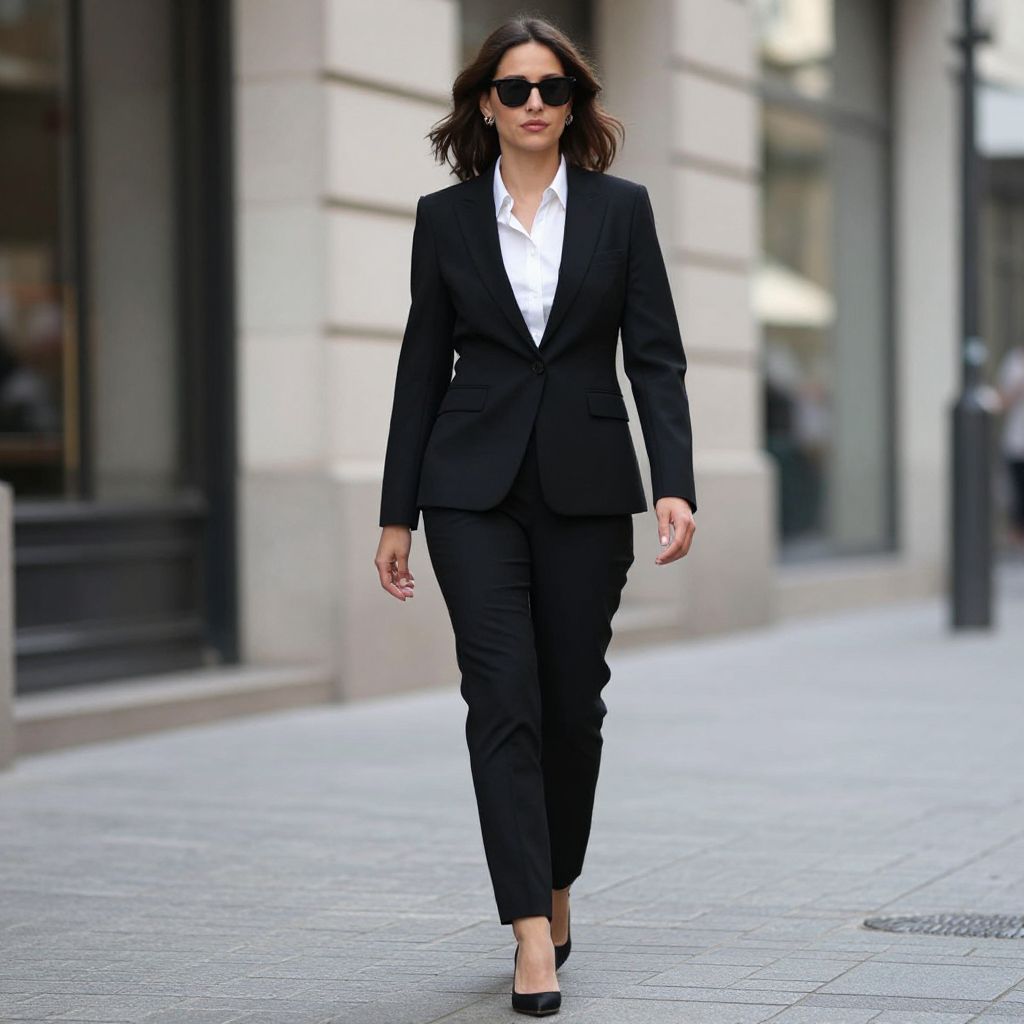 Trends Woman Office Wear Costume, woman in black suit and white shirt walking down a street