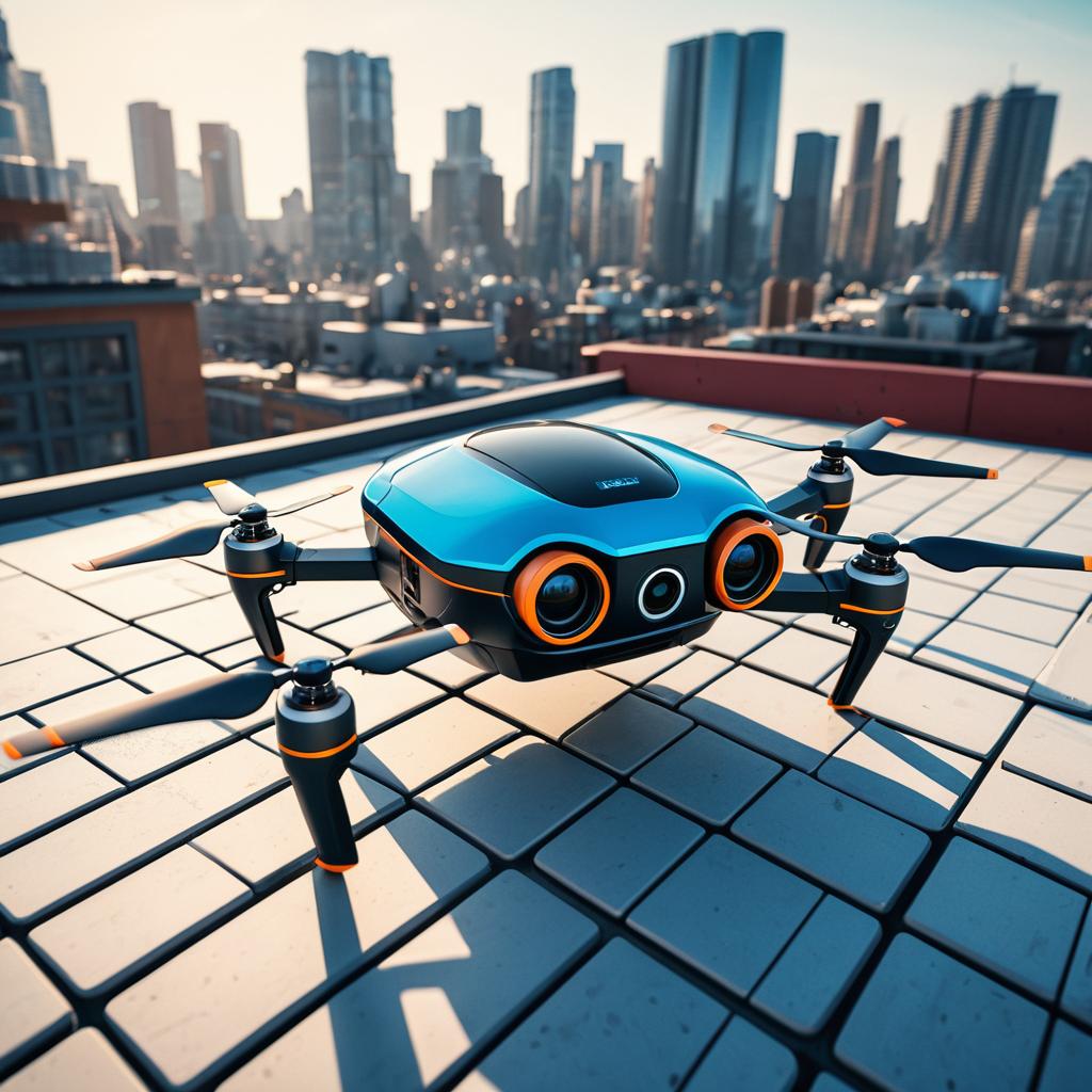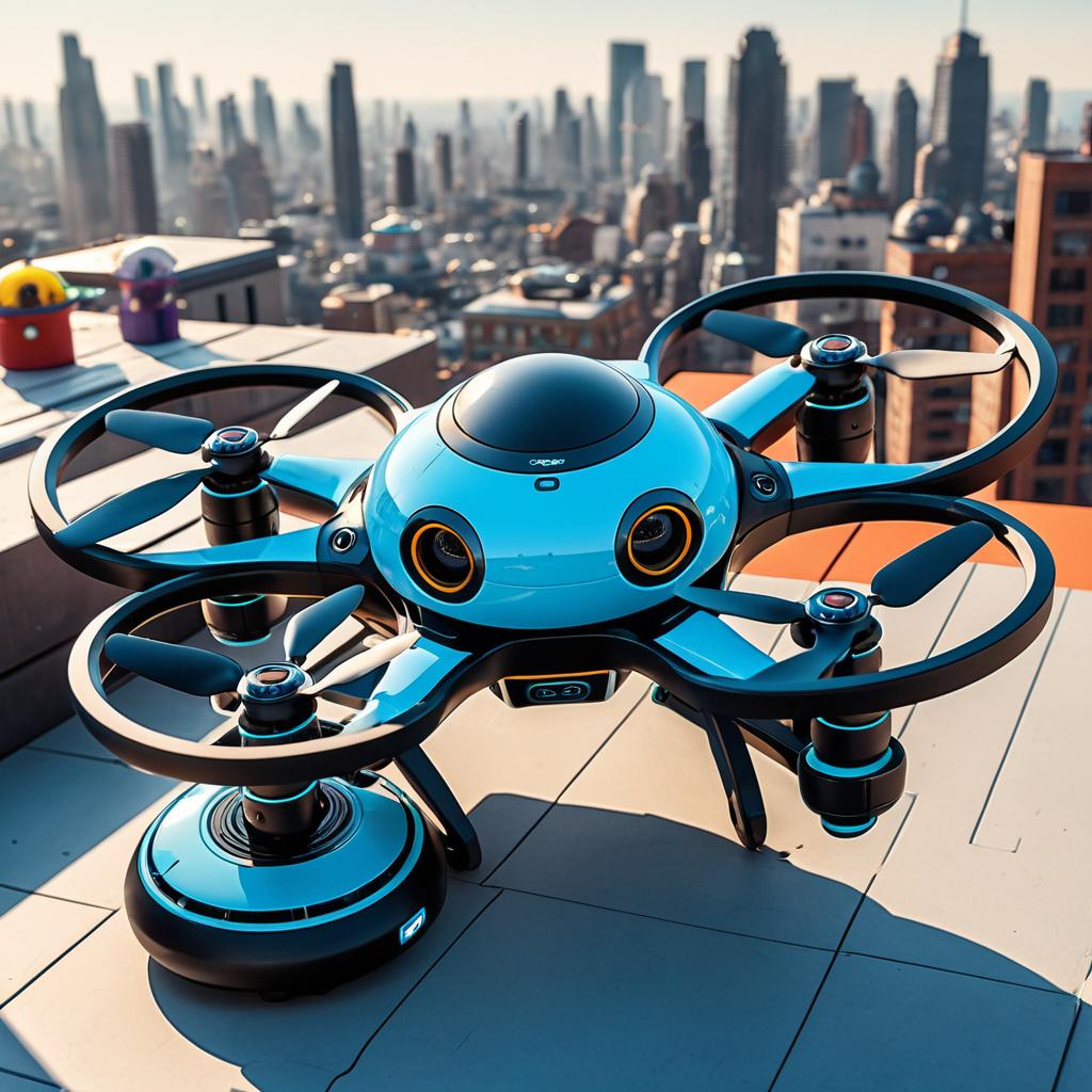 Friendly Toy Drone on Rooftop in Futuristic Cityscape