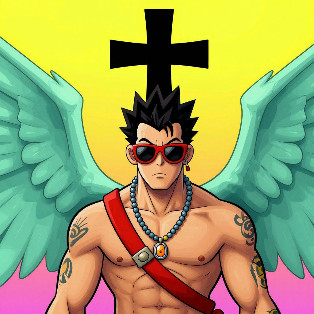The image is a vibrant and dynamic illustration by Jamie Hewlett, known for his work with the band Gorillaz. The central figure is a muscular man with spiky hair, wearing red sunglasses and a necklace with a pendant. He has a tattoo on his left arm and is adorned with a red shoulder strap. His wings, which are a light green color, extend from his back, adding a fantastical element to the scene. Above his head, a black cross is prominently displayed, contrasting with the bright background. The overall composition is balanced, with the figure centrally positioned and the cross and wings framing him. The colors are bold and saturated, creating a striking visual impact.