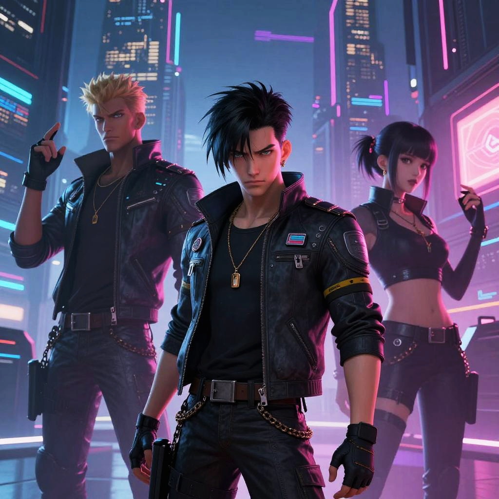 AI anime boys standing together in a futuristic cityscape at dusk, glowing neon lights reflecting on their sharp, stylized features, each character showcasing unique cybernetic enhancements and vibrant hair colors, ultra-detailed anime style with dynamic poses.