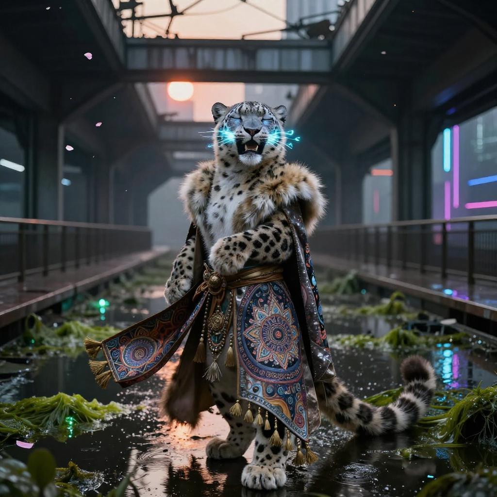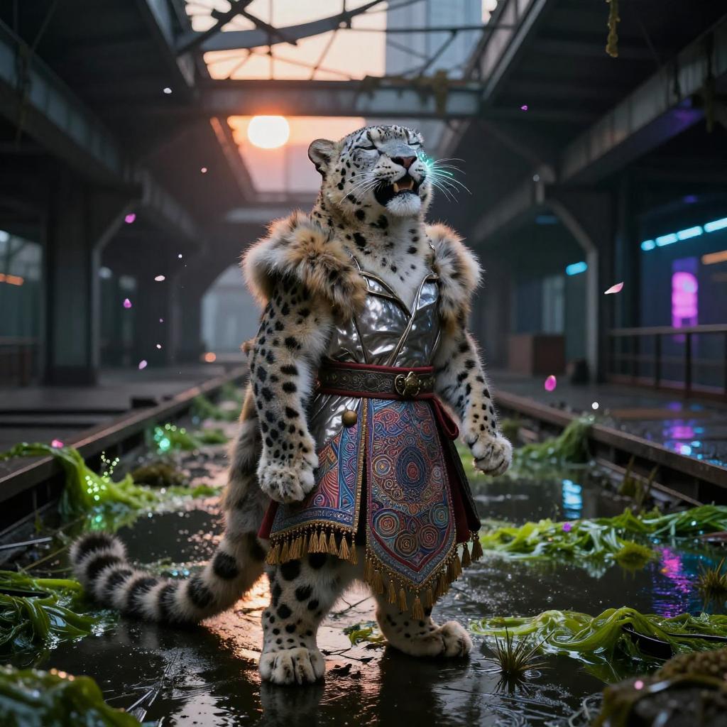 Best quality, masterpiece, ultra high res, raw photo, beautiful and aesthetic, deep shadow, dark theme, (photorealistic:1.4), masked snow leopard spirit with luminescent whisker sigils and frost-kissed fur, wearing fur-lined alloy mantle with flowing silk sash embroidered in intricate zentangle filigree and brass tassels, soft smile, open mouth, closed eyes, ((chiaroscuro, backlight, sunset, petals floating)), graceful poise, evocative atmosphere, magnetic presence, captivating mystique, intricate zentangle patterns, astonishing level of detail, striking perspective, a chaotic masterpiece balanced by harmony, vibrant color palette, ((outdoors)), abandoned subway concourse flooded with bioluminescent algae, rain-slick platforms, fractured skylights revealing a distant neon futurist skyline and drifting petal-like debris, inspired by futurist architecture