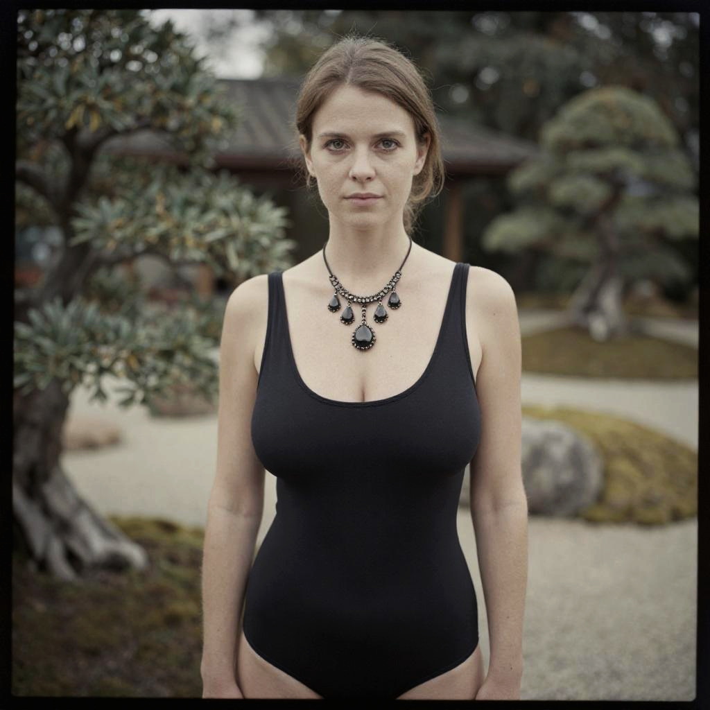 A woman, in a minimalistic black bodysuit with a scoop neckline, adorned with a statement necklace, captured in the serene ambiance of a Zen garden with bonsai trees, visual style: Calotype process. Sexy. Pretty face and beаutiful eyes. Big breasts