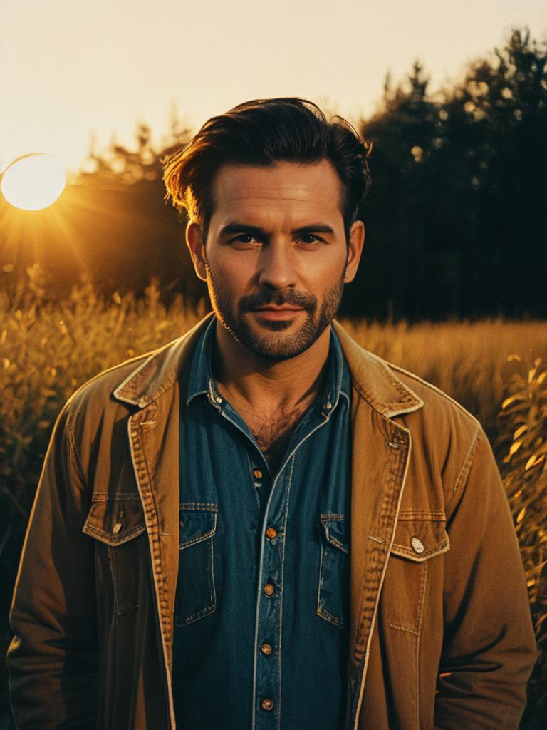 Man in Summer Casual Costume, photorealistic outdoor portrait at golden hour --sref 1390