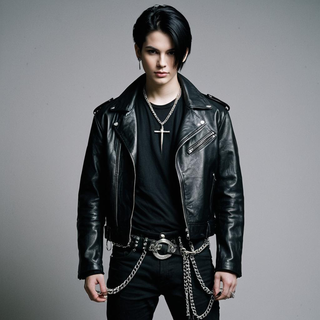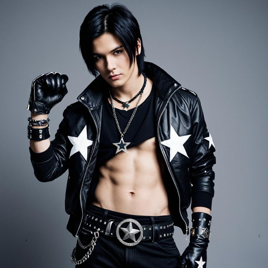 Portrait of a young male cosplayer with black hair wearing a black leather jacket adorned with white star patches. He has fingerless black leather gloves with star embellishments, a star pendant necklace, and a studded belt with a large star buckle. The subject's black shirt is partially lifted, revealing his toned abs. The background is plain and gray, emphasizing the detailed cosplay attire.