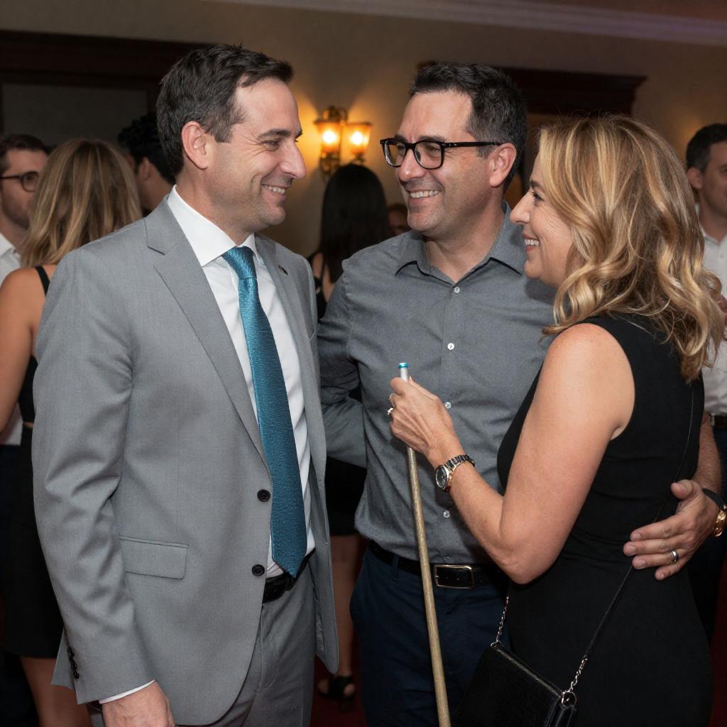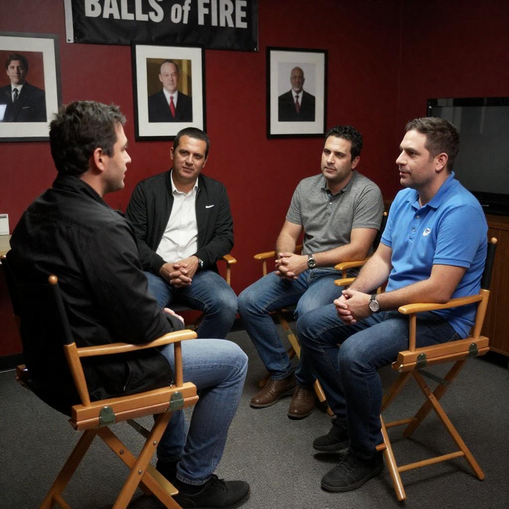 Photograph of five men in a dimly lit room, sitting on wooden director's chairs. Man in black jacket facing others, three men in casual shirts, one in black jacket and white shirt, one in blue polo shirt. Background has red walls, framed pictures, and a "Balls of Fire" banner. Man in black jacket on left, others on right. TV on right. Casual conversation.