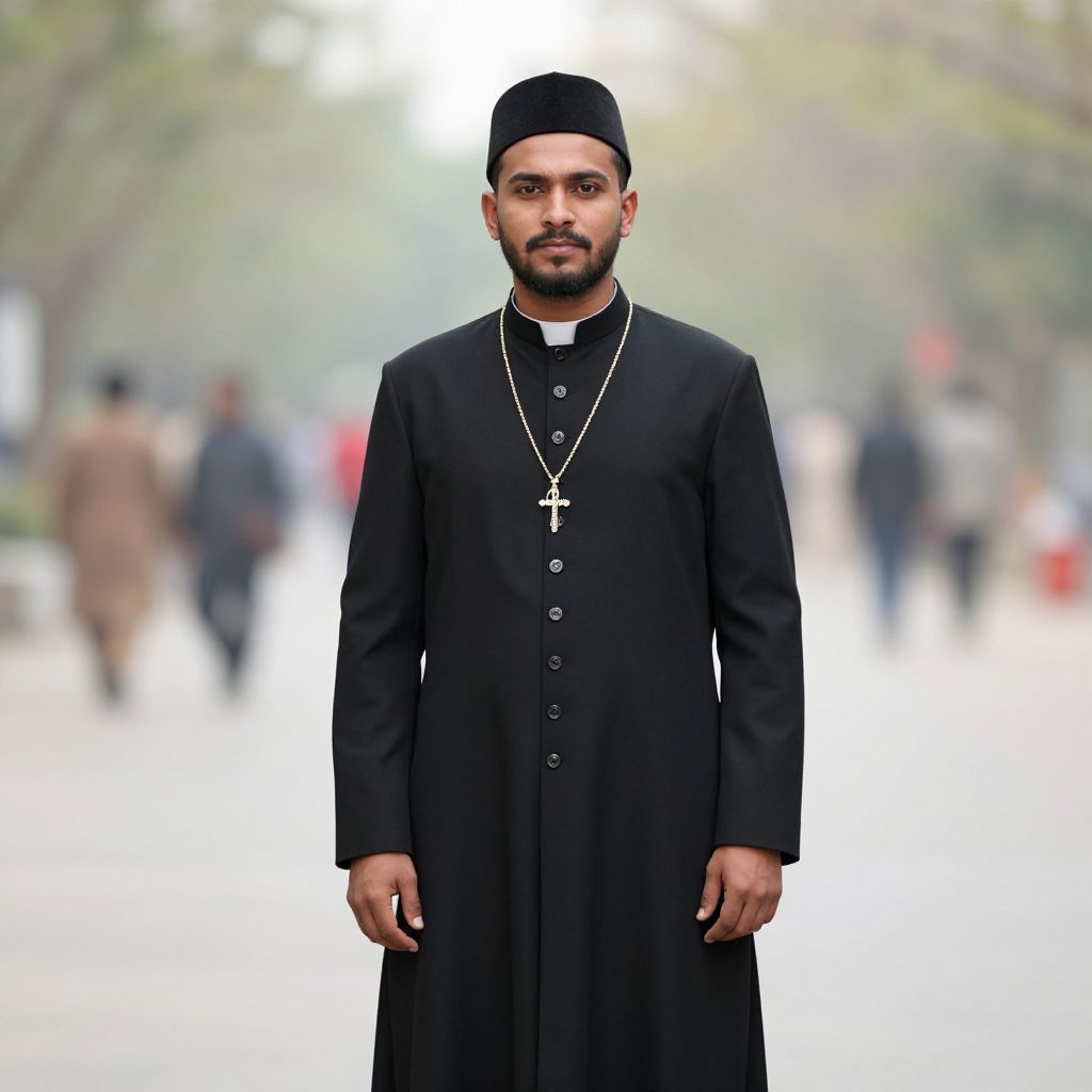 Black sherwani man costume, 1boy, male focus, solo, blurry background, blurry, looking at viewer, long sleeves, coat, outdoors, facial hair, hat, necklace, standing, realistic, buttons, black coat, jewelry, priest, mustache