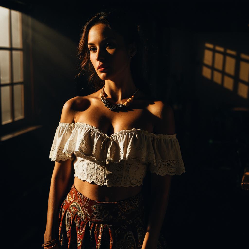 Photorealistic portrait of elderly fisherman in stormy coastal pier, wearing an ivory off-shoulder cropped lace top with delicate ruffle detailing and a long fitted paisley patterned skirt, accessorized with layered necklaces and thin bangle bracelets, soft cinematic lighting, shallow depth of field, dreamy atmosphere. --sref 1404
