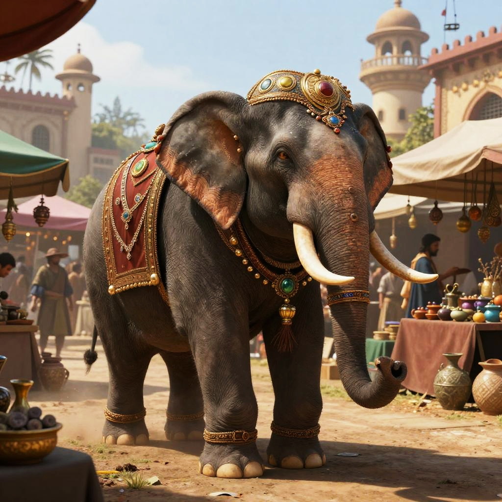 Loxodon merchant in a bustling market, elephant-like humanoid with ornate jewelry and rich fabrics, vibrant marketplace background with exotic goods, lively and colorful scene, intricate detailing on clothing and architecture, fantasy realism style.