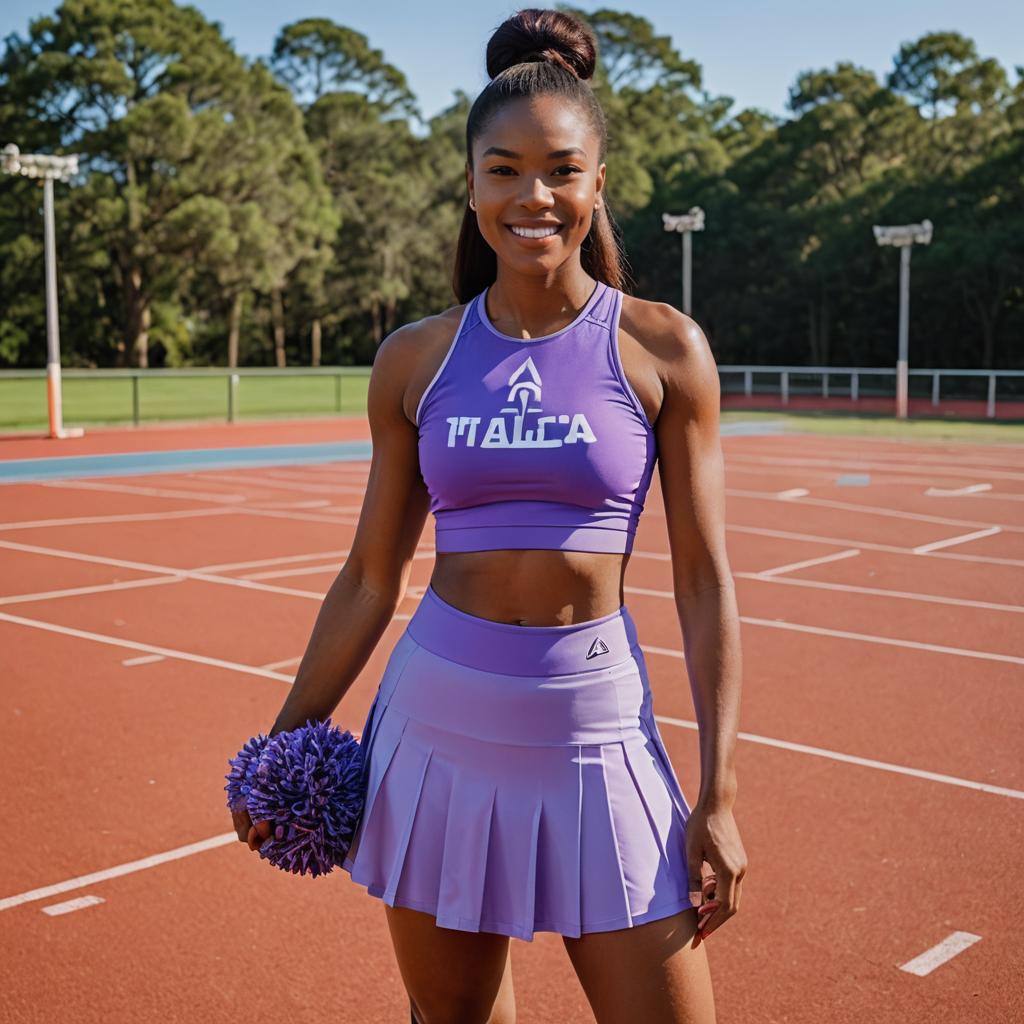 Lean and tall African American woman standing on a running track in an outdoor stadium. She wears a lavender pleated cheerleader skirt and a breathable spandex crop top with a team logo. The athletic outfit is complemented by lightweight lavender trainers. The sunny day highlights the vibrant purple and pink tones of her cheerleading attire.