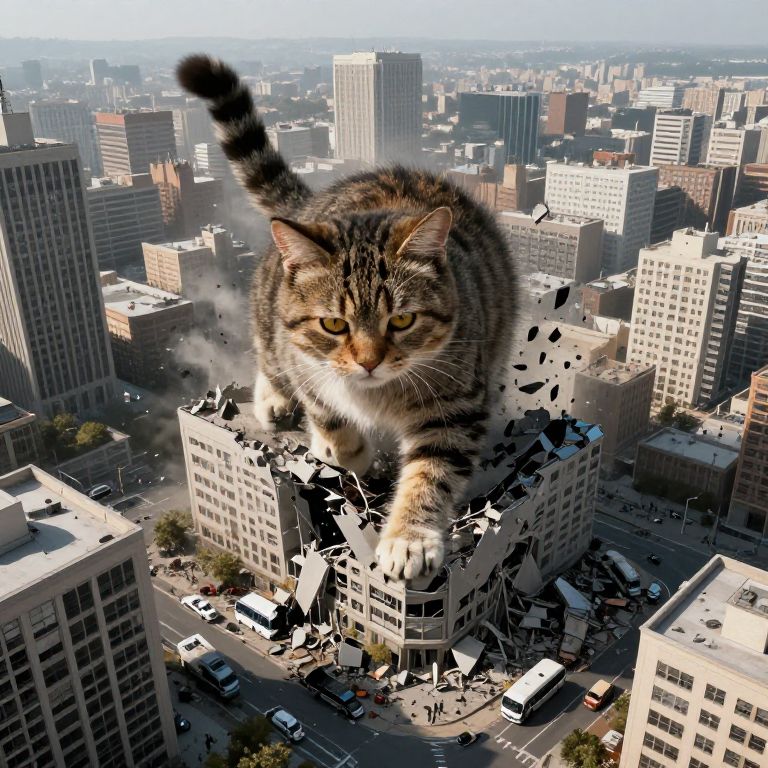 Cat destroying city from above, aerial view of monster cat stomping on an urban area, smashed buildings and overturned buses, dynamic composition emphasizing scale and power, muted colors with dramatic lighting highlighting destruction
