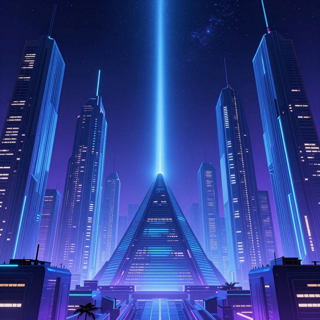 A digital rendering of a futuristic cyberpunk cityscape featuring towering geometric skyscrapers with glowing blue neon accents. Central to the composition is a stepped pyramid-like structure emitting a vertical beam of light into the starry night sky. The scene combines elements of sci-fi architecture with a vibrant mix of cool blues and purples, creating a high-tech, otherworldly atmosphere.