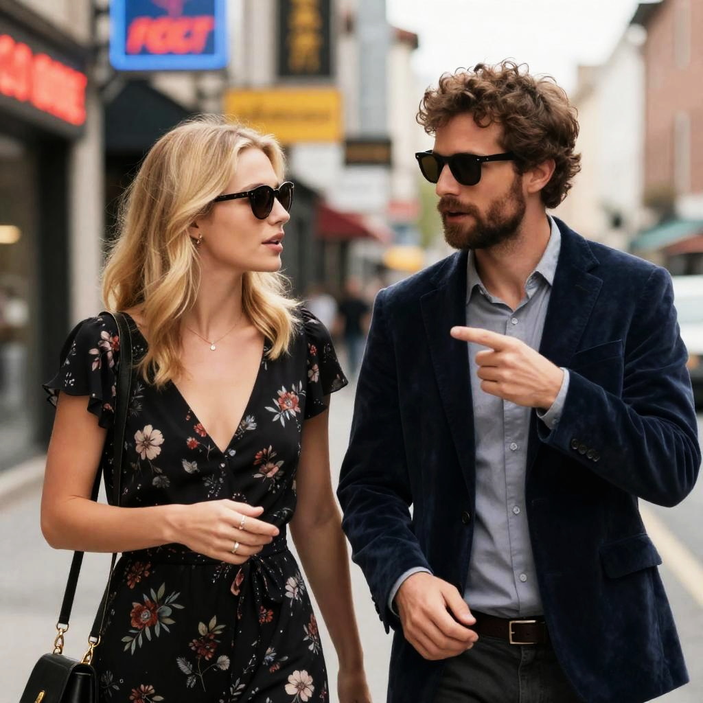 Photograph of a blonde woman with sunglasses and a black floral dress, talking to a bearded man with curly hair and dark sunglasses, wearing a dark blue velvet blazer over a gray shirt. Urban street background with neon signs and buildings. Woman holds a black shoulder bag. Man points with his right hand. Both have relaxed expressions.