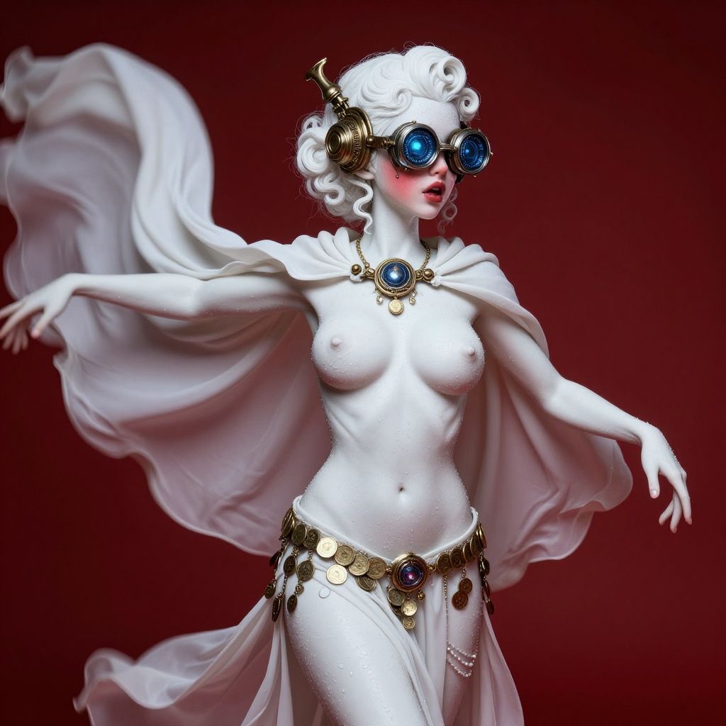Digital CGI artwork of a white-skinned, topless, ethereal woman with curly, white hair adorned with gold and blue circular glasses. She wears a flowing white cape that billows to her left, revealing her small breasts and smooth, slender physique. A gold and blue gem-encrusted belt with circular accents rests on her hips. Her expression is serene, with slightly parted red lips. The background is a solid, dark red, enhancing the contrast with her white attire and pale skin. Her right arm is extended outward, while her left arm is bent at the elbow. The style is reminiscent of classical fantasy art.