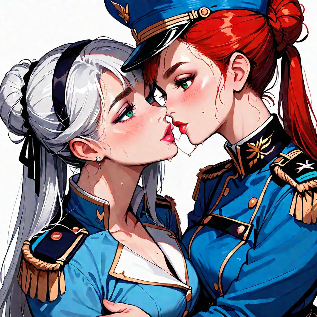 2girls, miorine rembran, suletta mercury, after kiss, blue dress, collarbone, couple, dress, epaulettes, eye contact, green eyes, grey eyes, hair bun, hairband, hat, hug, long hair, looking at another, military hat, military uniform, multiple girls, ponytail, red hair, saliva, saliva trail, simple background, sweat, thick eyebrows, uniform, white background, white hair, yuri best quality, score_9, score_8_up, score_7_up, score_6_up, score_5_up, score_4_up