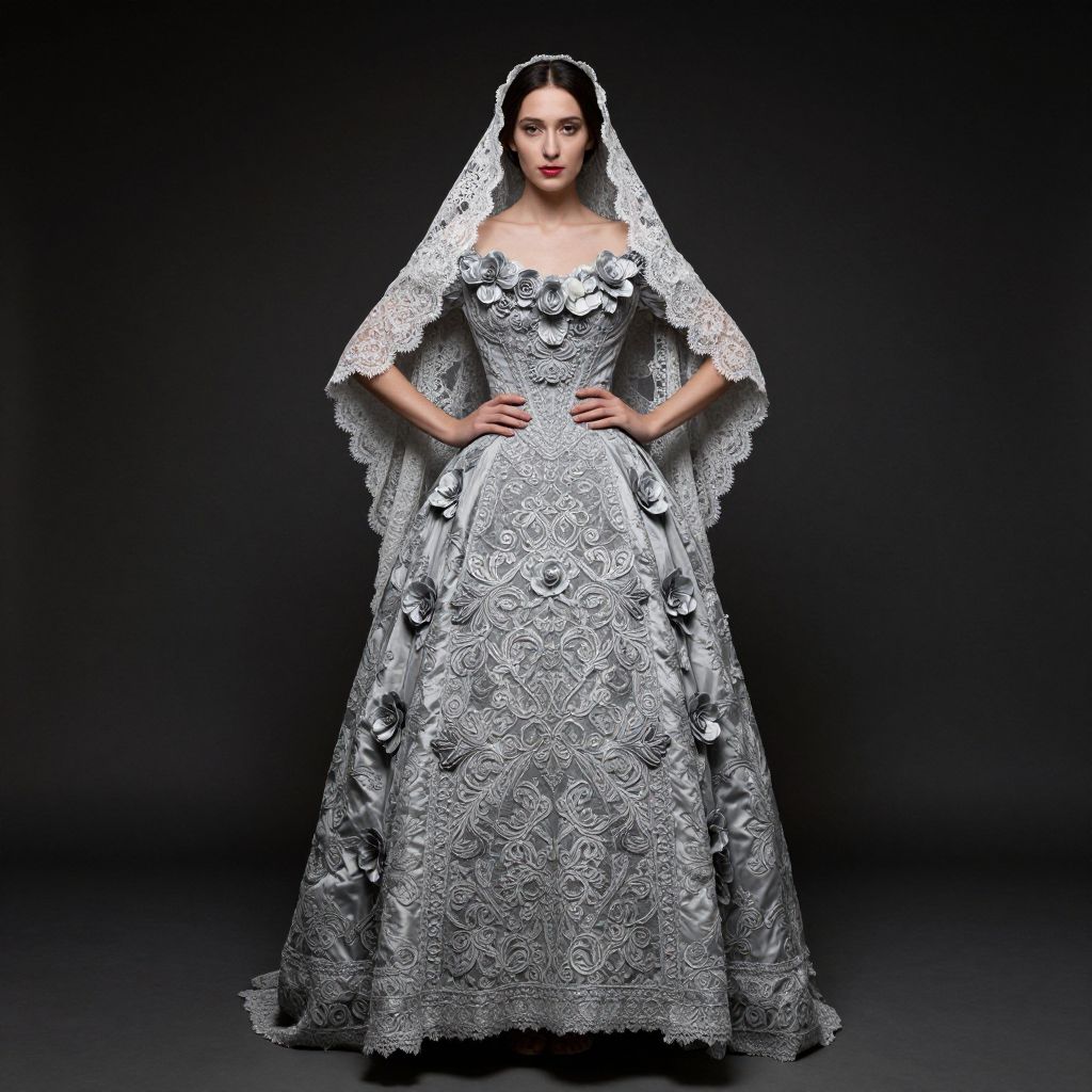 Photograph of a fair-skinned woman with dark brown hair, wearing an ornate, silver-gray, lace wedding gown with intricate floral patterns. The gown features a square neckline, short puffed sleeves, and a long, flowing train. She has a white lace veil draped over her head and shoulders. Her hands rest on her hips, and she stands against a solid black background, creating a stark contrast. The lace texture is detailed and elegant, with silver floral appliqués adding dimension to the dress. Her expression is neutral, and she gazes directly at the camera.