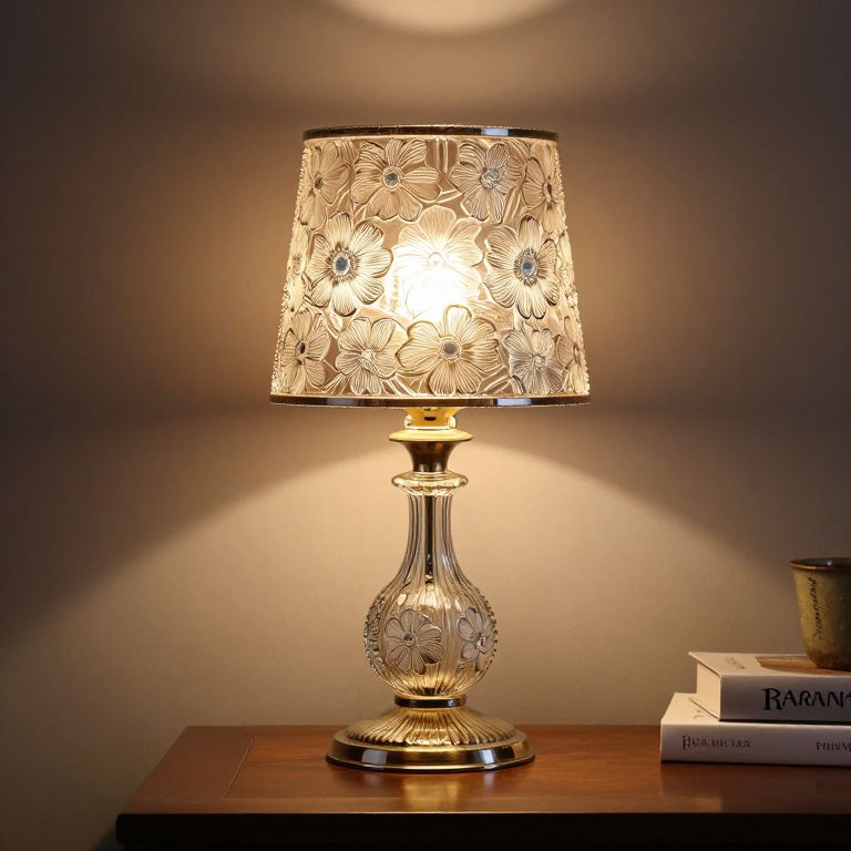 Photograph of an ornate table lamp with a transparent glass base featuring intricate floral patterns. The lampshade is also adorned with detailed floral designs and emits a warm, soft glow, casting a gentle light and shadow on the beige wall behind it. The lamp sits on a wooden table, which holds a stack of books, including one with "Barbara" visible on the spine. A small, metallic cup is partially visible on the right. The overall ambiance is cozy and elegant, with a focus on the intricate, vintage-style lamp.