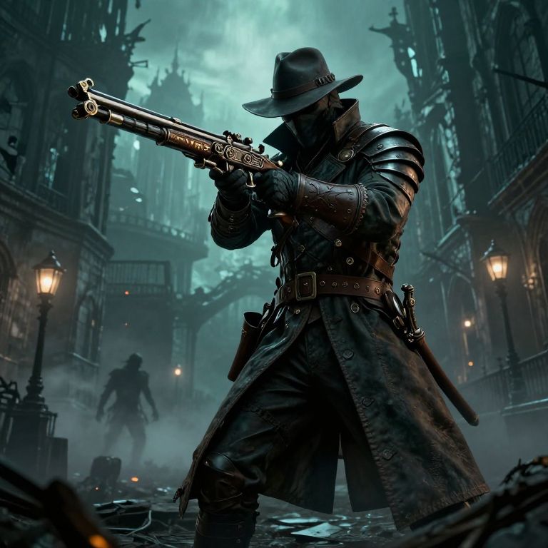 A mysterious, cloaked hunter standing amidst a dark, eerie, Victorian-inspired cityscape in a dramatic, action-ready pose, The hunter is dressed in a weathered, long trench coat with intricate stitching, a wide-brimmed hat that casts a shadow over their masked face, and reinforced leather armor adorned with metallic buckles and straps, They hold an ornate, mechanical crossbow, its design featuring gears, engravings, and glowing runes along its limbs, aimed slightly upward in a ready stance, The background features towering, decayed buildings with shattered windows and gothic architecture, enveloped in a thick, teal-hued mist that enhances the ominous atmosphere, Dimly lit street lamps and faint orange embers drift in the air, adding warmth to the otherwise cold and desolate setting, Silhouettes of monstrous creatures lurk in the foggy distance, hinting at danger, The foreground is illuminated with soft, focused lighting, accentuating the texture of the hunter’s attire and weapon, while the rest of the scene is cast in moody shadows, overlaying the hunter and adding a supernatural, arcane touch