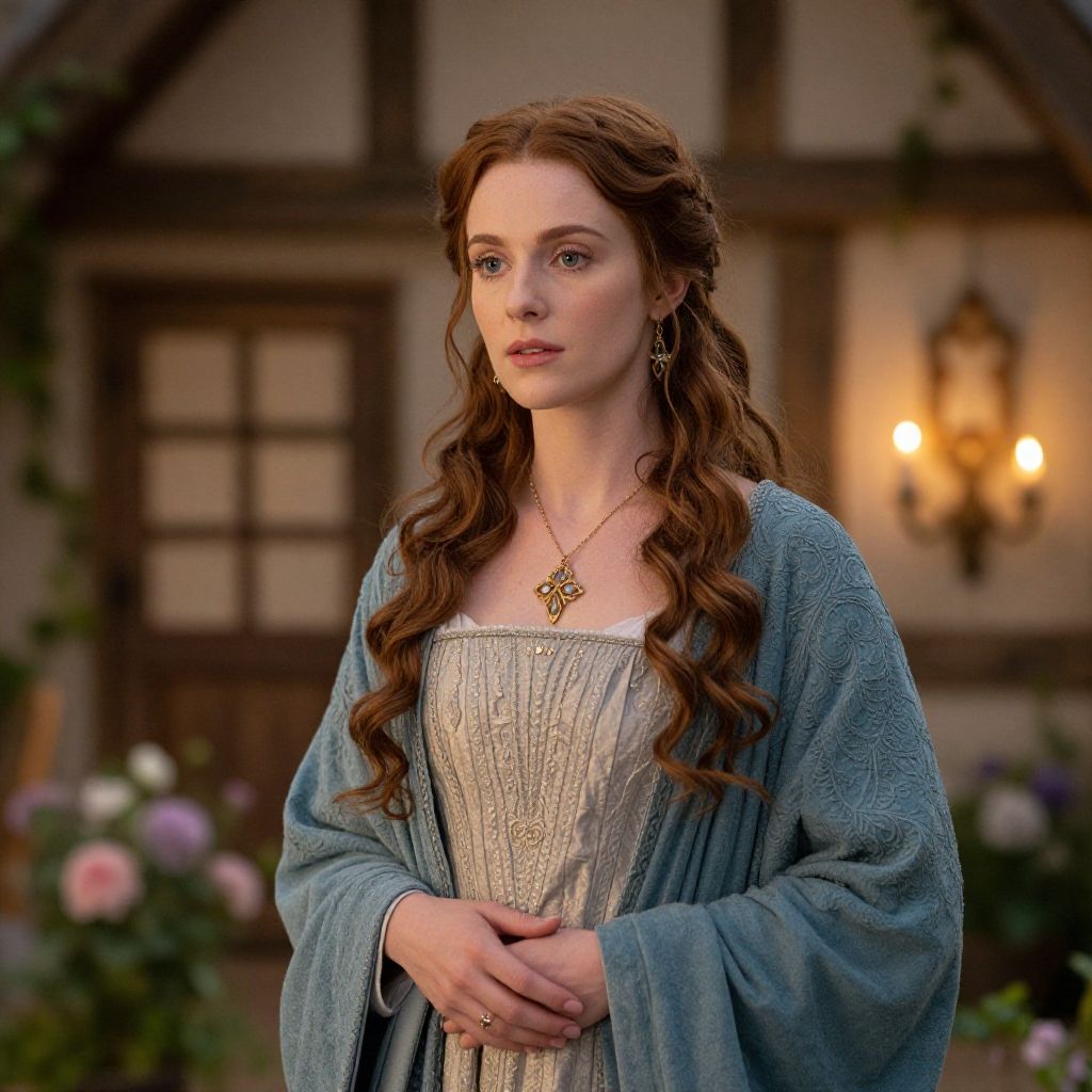 Photograph of a young white woman with curly auburn hair, wearing a beige long-sleeve shirt and brown pinafore dress, standing in a dimly lit, rustic bar. She holds a glass of blue-tinted liquid close to her lips, gazing thoughtfully at it. Shelves behind her are filled with various liquor bottles, some illuminated with warm lights, creating a cozy, vintage ambiance. The background is blurred, emphasizing her contemplative expression and the glass. The textures of her clothing and the wooden shelves add depth to the scene.