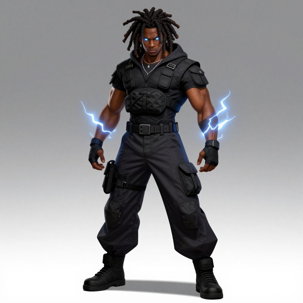 Chord a muscular black man with thick dreadlocks wearing combat hoodie with baggy pants and black shoes and lightning powers and glowing eyes Julie Dillon Art style,