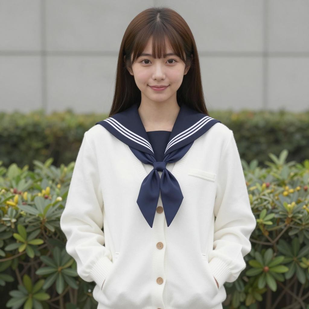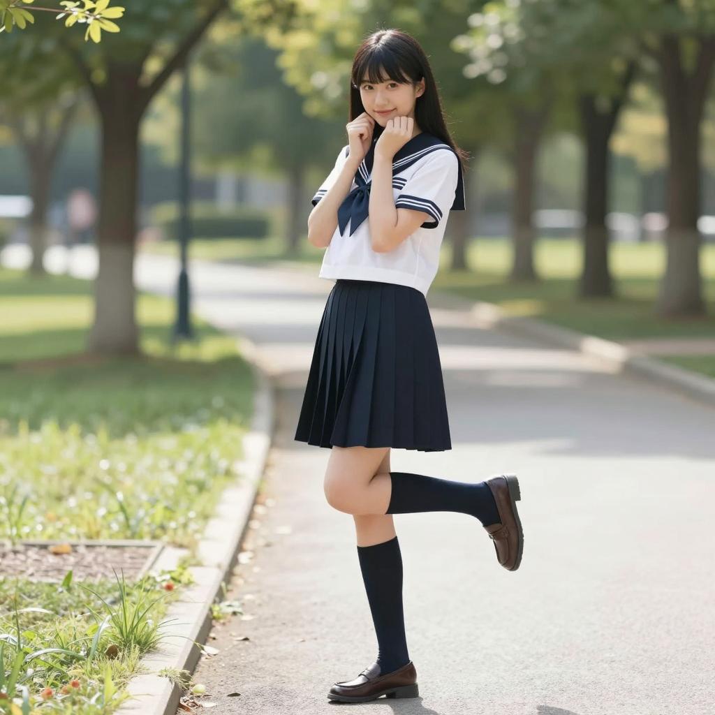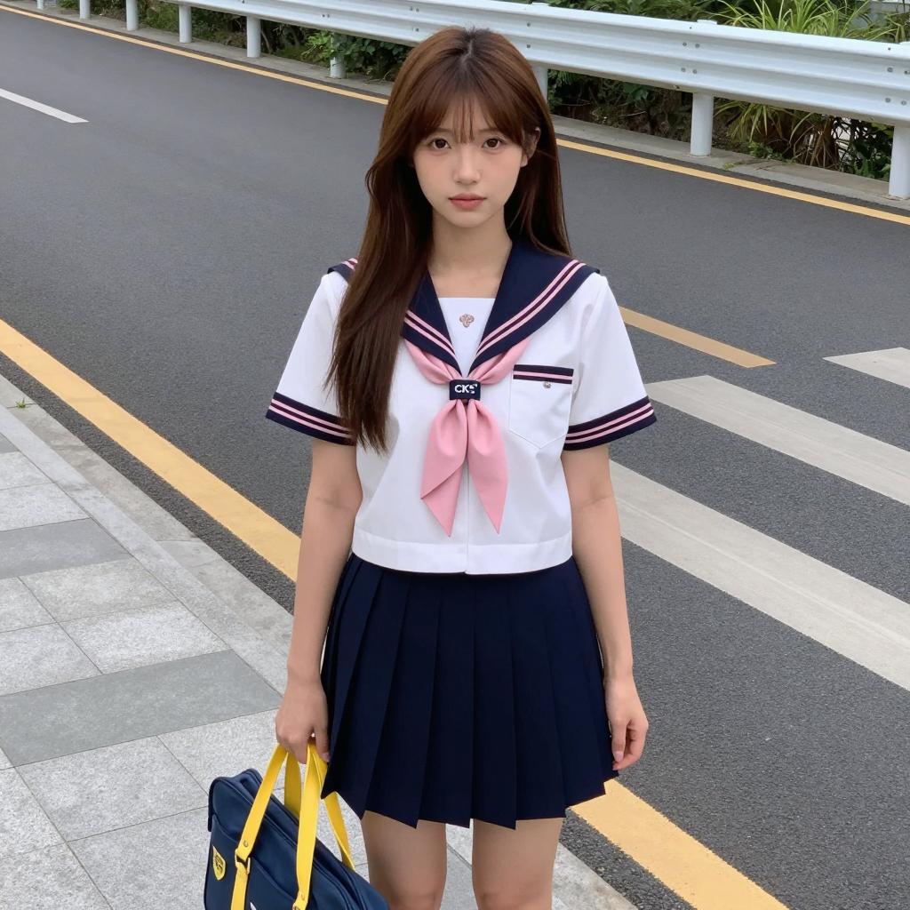 Asian Schoolgirl in Japanese Uniform on Sunlit Street
