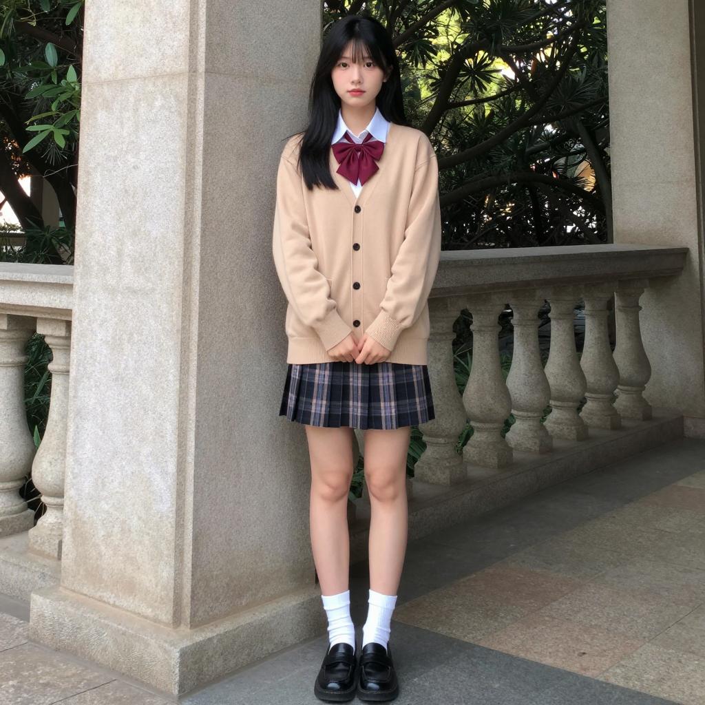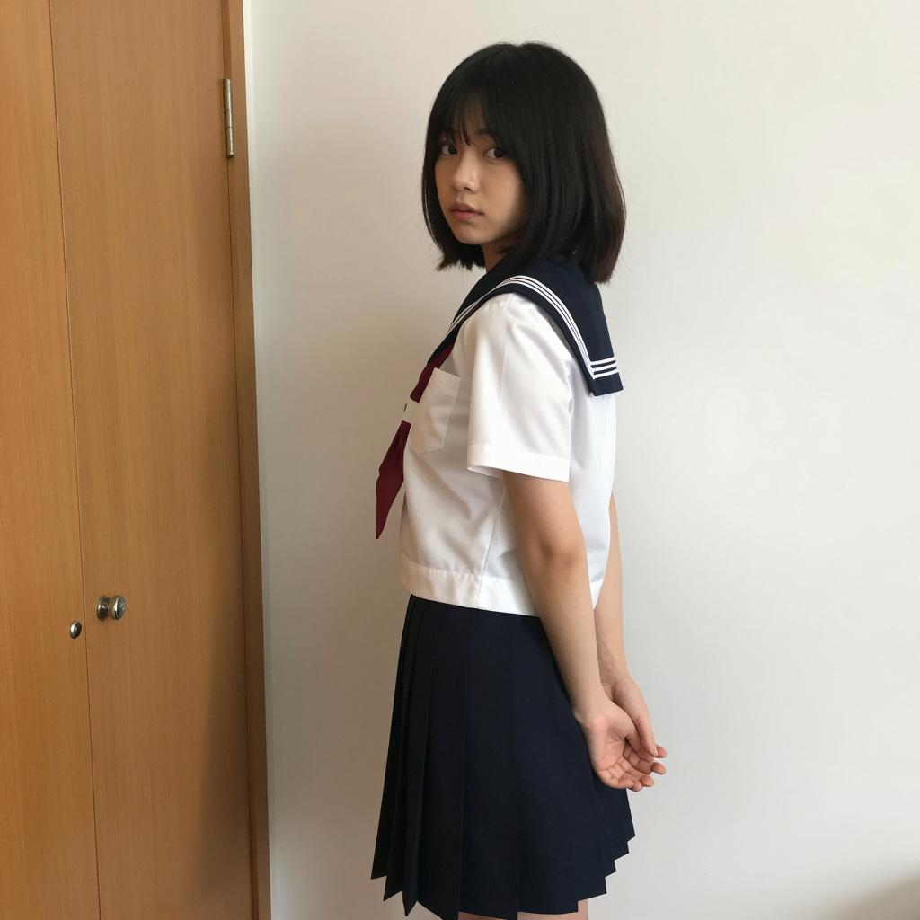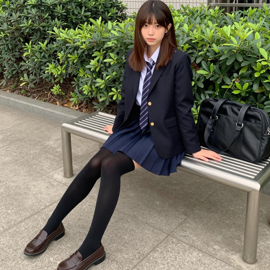 Asian Schoolgirl in Japanese Uniform on Sunlit Street
