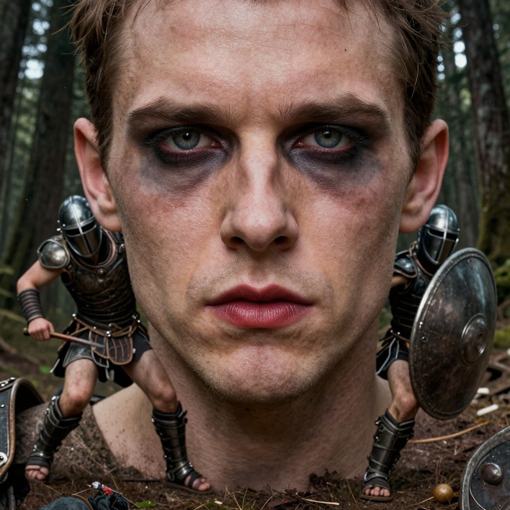 Grunge style, photo of man, ((Establishing shot:1.7)(gladiator, dreesed, Unlimited Blade Works, wearing armor and leg splints with full face helmet and sandals, Shield, Unsheathing)), dynamic background Black Forest, extremely detailed face eyes lips, (face:Triangle Face, drooping eyelids, [eye color blue], long nose, full lips, flat cheeks, double chin), heavy slut makeup, heavy slut blusher, heavy slut eye shadow, heavy slut eyeliner, heavy slut mascara, heavy slutlip liner, red lipstick, ((ultra realistic, extremely fine details, natural skin texture)), extremely detailed eyes lips nose, Textured, distressed, vintage, edgy, punk rock vibe, dirty, noisy