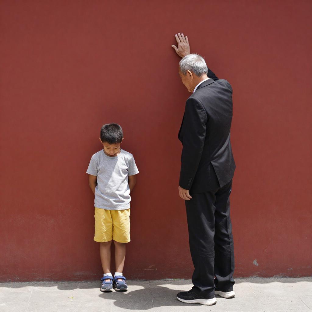 Photograph of an elderly man in a black suit and sneakers, standing with his right hand raised, facing a young boy in a gray t-shirt and yellow shorts, leaning against a bright red, weathered wall. The boy looks down, while the man looks at him. Sunlight casts a strong shadow on the ground.