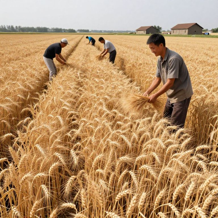 A detailed view of a successful agricultural harvest, showcasing rows of perfectly matured wheat swaying gently in the wind, farmers smiling as they gather the crops, and a backdrop of a peaceful countryside with a few rustic farmhouses in the distance.