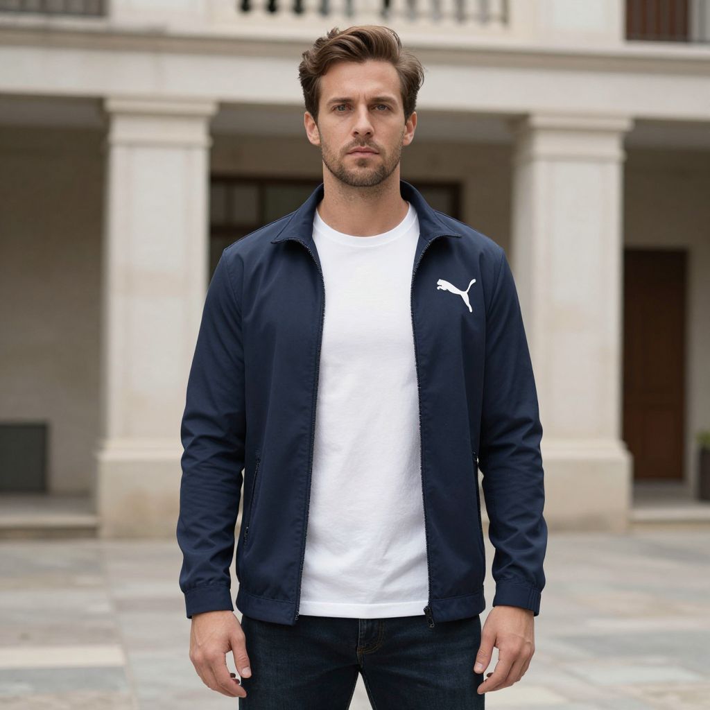 Photograph of a handsome Caucasian man with short, styled brown hair and a trimmed beard, standing in front of a classical building with white columns and stone walls. He wears a navy blue Puma tracksuit jacket over a plain white t-shirt and dark blue jeans. His expression is serious, with a slight frown, and he looks directly at the camera. The background is slightly blurred, highlighting the man as the focal point. The lighting is natural, suggesting an outdoor setting. The man's physique is athletic, and he exudes a casual, sporty style.