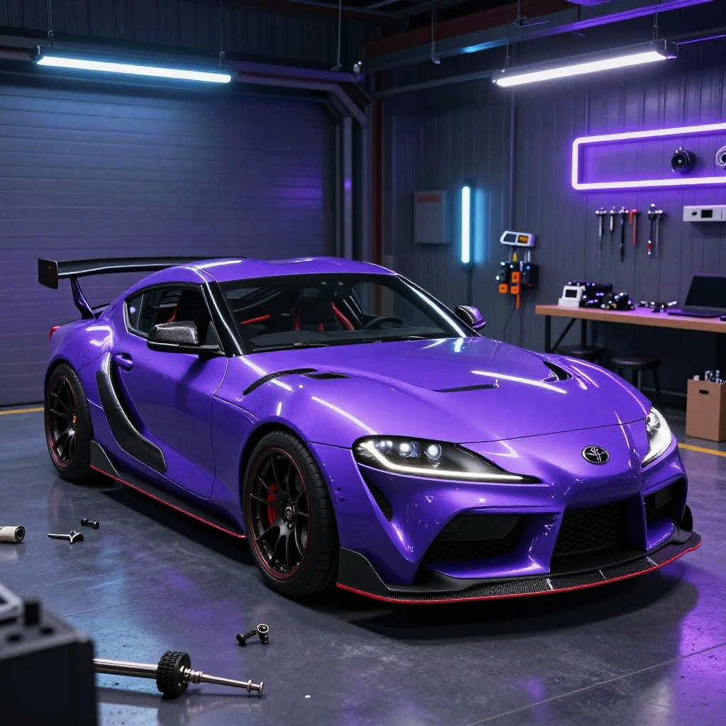 Purple Toyota Supra customized with futuristic modifications in a high-tech garage, illuminated by blue and purple LED lights, tools and parts scattered around, hyperrealistic rendering of metallic textures, detailed interior and exterior visible through open doors.