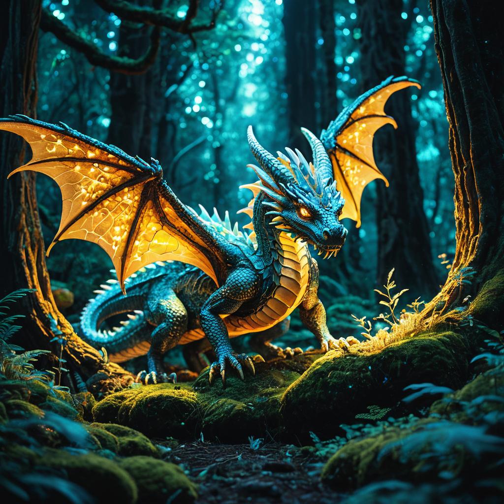 A photorealistic digital painting of a blue crystal-winged dragon standing in an ancient, mystical forest. The dragon is illuminated by a glowing crystal on the forest floor, surrounded by luminescent fungi and moss-covered terrain. The scene features cinematic lighting with a shallow depth of field, capturing intricate details of the dragon's scales and wings, evoking a blend of Studio Ghibli and Art Nouveau styles with fantastical elements.