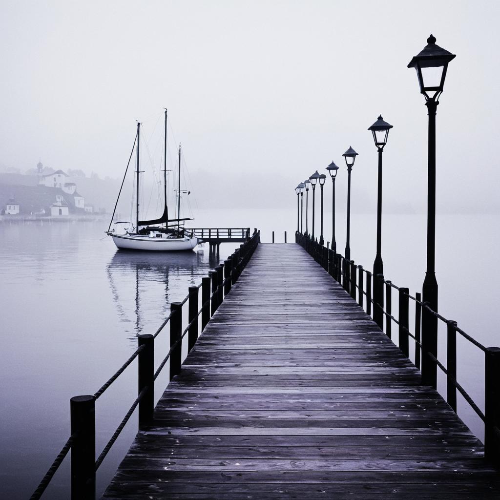 A peaceful marshland landscape enveloped in thick fog, featuring soft muted greys and whites with subtle misty lavender hues. Tall grasses and reeds rise gently from calm, reflective water, creating a tranquil and ethereal atmosphere with delicate silhouettes fading into the foggy background.
