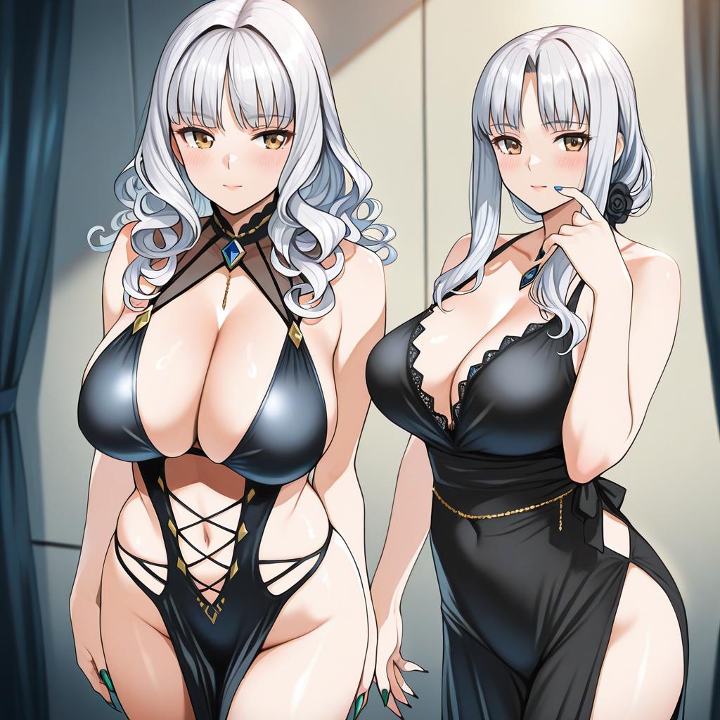 Carmilla (fate), fate (series), 1girl, yellow eyes, long hair, white hair, curly hair, grey hair, large breasts, cleavage, thighs, navel, bare shoulders, nail polish, long fingernails, by artist techi (techi35499), illustrious