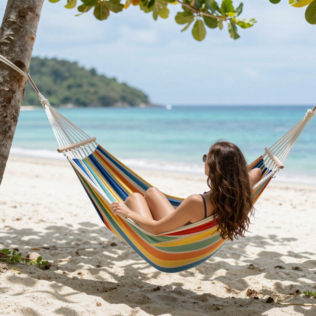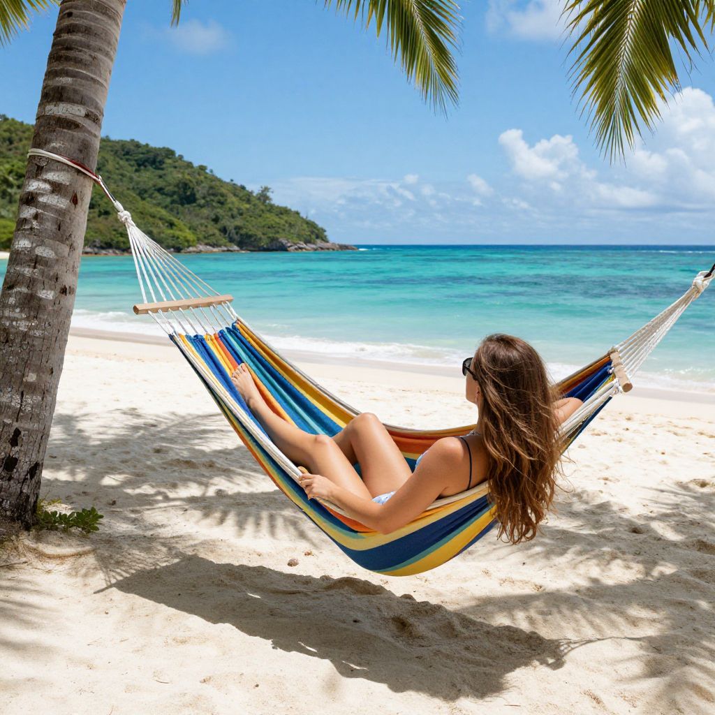 Embracing the rhythm of the ocean breeze, a woman finds solace in the vibrant embrace of a hammock, where the symphony of colors mirrors the boundless freedom and serenity of the tropical paradise.