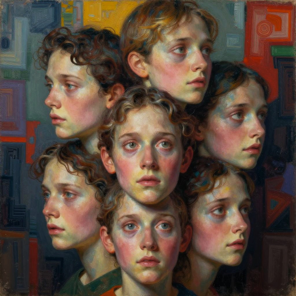 Gesichter in surrealist style, multiple human faces blending into an abstract background with vibrant colors and intricate textures, expressing a range of emotions from joy to sorrow, hyper-realistic details, cinematic lighting