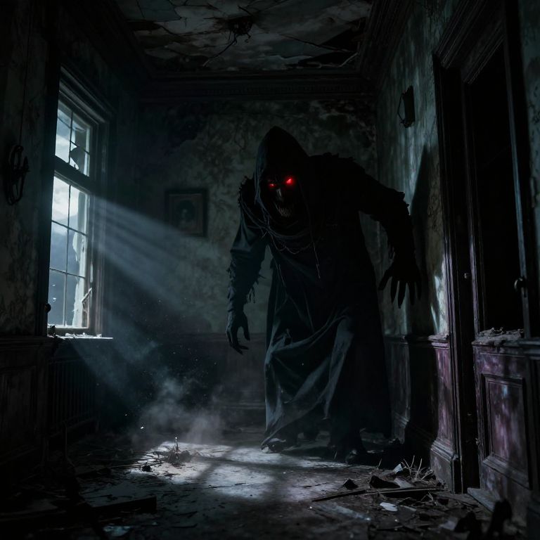 Dark shadow with red eyes creeping through abandoned haunted mansion halls, glowing eyes piercing ancient decayed wallpaper, broken windows letting in pale moonlight, dust particles in air, gothic horror scene with deep shadows and dim lighting